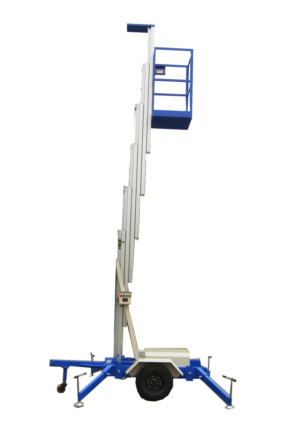 Towing Aerial Work Platform has two inflated wheels installed on the chassis for realizing long distance transportation function. Only Single Mast and Double Mast aluminum aerial work platfor can upgrade to this model. It can be hooked to the vehicle to transport.